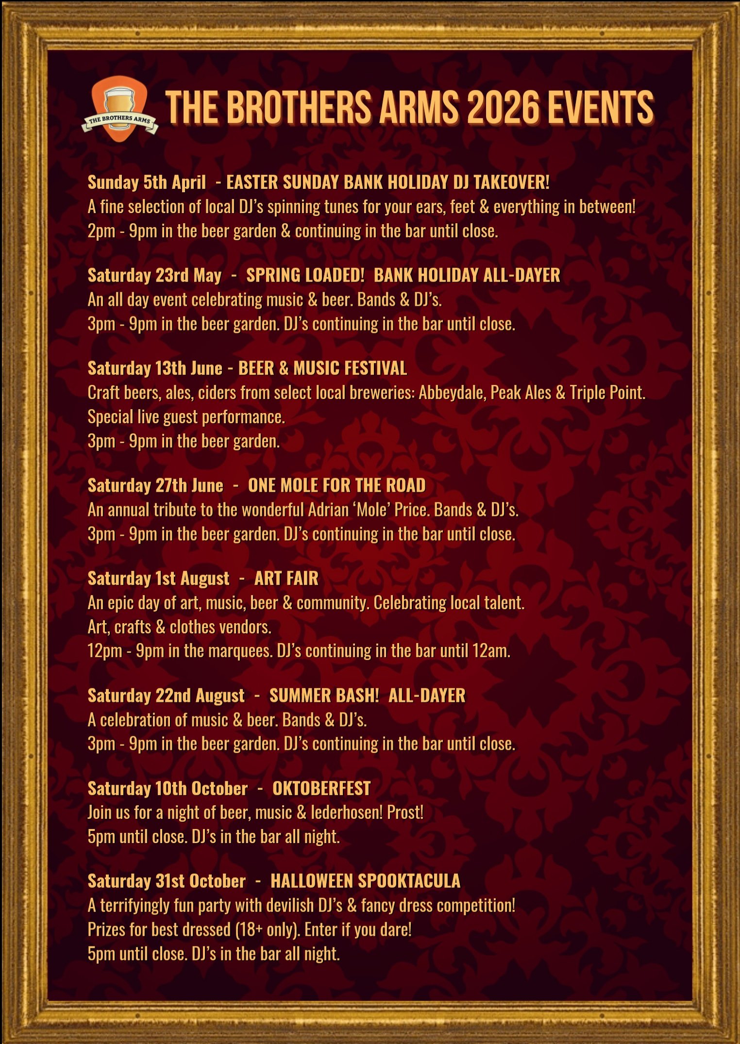 The Brothers Arms hosts regular Live Music and Arts events, 2026 main events are listed in the poster below. Monday nights is our Open Mic fixture in collaboration with our friends at Jarred Up, their FB page is HERE. The best way to keep up to date with our schedule is to check out our Facebook and Instagram pages. Links to our social media pages can also be found above.